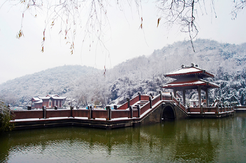 而登上相对的啸风亭和震旦亭,古典雅致。登亭远眺,如画江山尽收眼底:山上树木葱茏,暗香浮动,山石嶙峋;山下土地阡陌纵横,仿佛一幅水彩画;邻近的城市高楼大厦鳞次栉比,错落有致的树木;夜晚更是繁星点点,山下霓虹闪烁,魅力非凡。