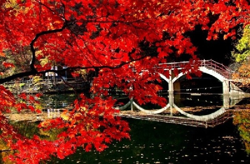 我们是从北门进入的景区,映入眼帘的是一大一小的双峰,俏高山其状如门,故得名:关门山。深谷的河道中有潺潺流水,在静谧的山林中发出优美的声音。山路很狭窄,有的是上下的石阶,隔一段距离还有些依山傍水的栈桥。行走起来小路跌宕起伏,栈桥九弯十八曲不见尽头。在溪水河畔,枫树群拥在那里,高耸参天,冠展相融。远远望去仿佛一片红海,走进去便是红彤彤的世界,一缕缕阳光从树缝隙间泻下,让你感觉到的是林间仙地。让人不禁感叹“霜叶红于二月花”,这里漫山枫叶,层林丹染。我们在如此美景下拍了很多照片,留下了美好的回忆。接着逛下去,发现关门山不愧有“小黄山”的名号,险峰峥嵘,怪石嵂矶,奇松挺拔,鬼斧神工精雕细琢而成的天然美景。在东北看到如此美丽的山,真是难得一见。美景让我思绪翩翩。山峻为险,这里的山透着美貌,威武姿雄多霸气。水多为濶,这里的水蕴含着秀丽,细浪淙潺尽娇娆。这里云美,山美,雾美,三者浑然一体,分外娇娆,轻雾缭绕,扑朔迷离;远处云蒸霞蔚,织云弄巧;山峰若隐若现,妩媚含羞。