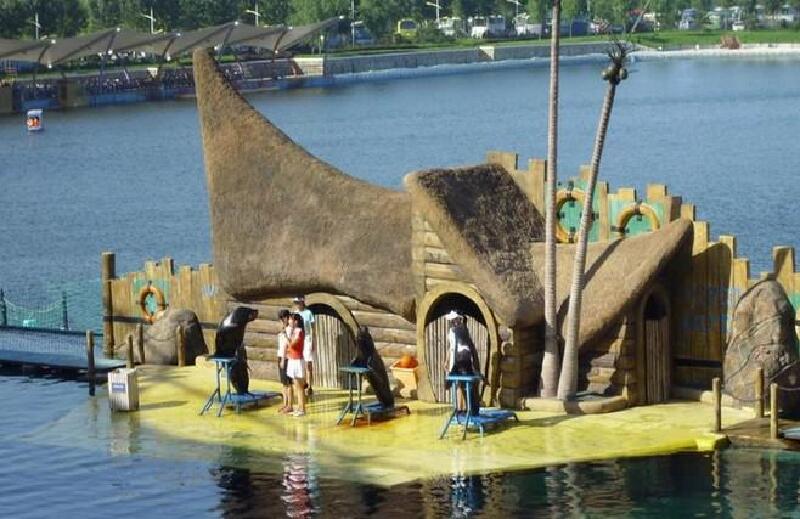 乐岛的特色建筑就是木屋。这里的木屋一般是水上建筑,面积不大,但是精巧可爱,十分引人注目。木屋前经常会出现一些海豚等的海洋表演,其乐无穷。来到乐岛,吃住行游都不是问题。