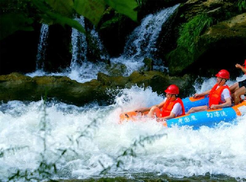 桃源河大峡谷是几十万年的地壳变迁形成的的奇峰绝壁,漂流就是在其中进行的,。如若你认为桃源河的漂流和其他漂流一样,溪水清清,稍有湍流,一条竹筏,一组七八人一筏,坐竹凳上沿溪顺水而下,那便是大错特错了;桃源河的5公里漂流,非一般的感受。只因大峡谷上有飞泉瀑布堪称奇绝;现仍有宽43米,落差48米的梯级大瀑布,响水惊天;而珍珠滩、犀牛潭、玉女裙诸多瀑布,简直风情万种美不胜收;如珠峰,这里原始古生物化石群亦再现亿万年前海洋生物画面;而地下溶洞奇景,堪称喀斯特地貌一绝。在这里,中国魔幻漂流、峡谷冲浪与三道响大瀑布遥相呼应,浑然一体,天一合成,形成桃源河漂流旅游景区独特的水上娱乐景观。