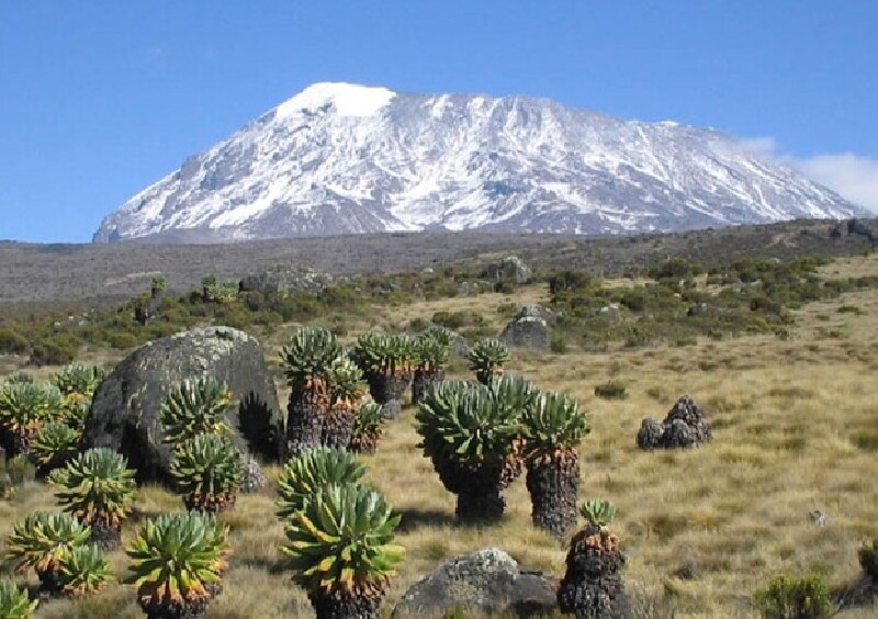 斯瓦希里语中,意即“光明之山”。作为非洲最高的山脉,乞力马扎罗山(Kilimanjaro)位于坦桑尼亚东北部及东非大裂谷以南约160公里。乞力马扎罗山是一个火山丘,主要由基博、马温西和希拉三个死火山组成,面积约756平方公里。乞力马扎罗山素有“非洲屋脊”之称,“非洲之王”也因其无可企及的高度而得名。草地在不同的地形部位分别上升到4200~5100米,再往上则为高山荒漠或高山冰。3000米以上逐渐过渡为高山草地带、荒漠带和积雪冰。海拔2700米以上为草地,海拔2000~3000米为温带森林带;海拔在1000~2000米,为亚热带常绿阔叶林带;。背风的北坡,气候干燥,热带雨林几乎不复存在;南部海拔在1000米左右,为热带雨林带。海拔1800米以下的山麓南坡,多已开垦为耕地,种植香蕉、咖啡、谷物和蔬菜。当地政府致力于保护热带动、植物资源,并且因地制宜的特色发展旅游业,将乞力马扎罗山一带开发为乞力马扎罗国家公园