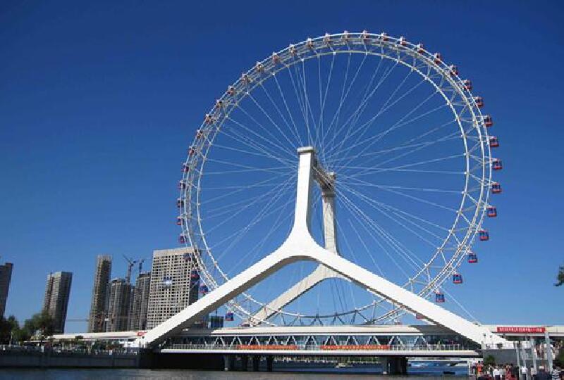 米,相当于35层楼高,是世界上唯一一座建在桥上的摩天轮。古文化街:以天后宫为中心的古文化街,南口的牌楼上高悬“津门故里”大匾,标志着这一带是800年前的一处居民聚落点。金代在这里建立了天津城市最早的政治建制——直沽寨,今日市区就是以这一带为原始中心区域而逐渐拓展的。这里是天津的发祥地。南市食品街是一座古典宫城式建筑组群,在这里可以品尝天津的很多小吃,津味津韵十足。郊区的景点主要以蓟县为主,在蓟县有盘山风景区、蓟县独乐寺、黄崖关长城风景区、盘山烈士陵园、九龙山国家森林公园、九山顶自然风景区、八仙山国家级自然保护区等。