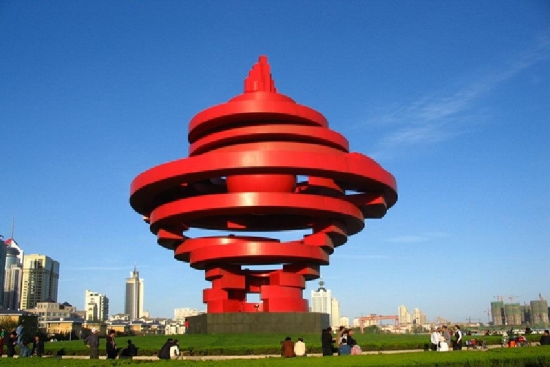 “五月的风”是国内最大的钢质城市雕塑,有30米高,27米宽。雕塑的起源是为了纪念青岛作为“五四运动”的导火索这一主题。简洁的线条、强劲有力的弧度,螺旋上升的风的形状,让这座红色的雕塑不但给人“劲风”腾空的蓬勃之势,火红色的颜色冲击着人们的视觉,也是红色革命的象征。“五月的风”不但展现了充满生命力和拼搏精神的时代精神,也是现代化青岛的写照。