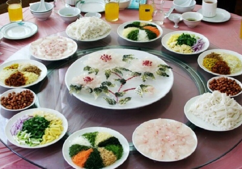 说说这著名的横县鱼生。横县鱼生俗称“两片”,是横县极具代表的饮食文化。不仅展现了横县高超的烹饪技术,也展现了它独特的饮食文化。它这么出名,与之材料的挑选、做法的特别、配料的搭配都有不可分割的关系。郁江是横县的重要河流。其水势湍急,水质上乘,产自这的鱼多是尾部肌肉发达,口感极好。最为出名的便是肉食性生猛鱼类花鱼和杂食性的青竹鱼,是极好的材料。而师傅的刀工也是极为有看头的。要在盈尺之鱼上经过多道程序,保证横切的技术精湛,方能出炉一盘造型精美,美轮美奂的鱼生。除此以外,特别要注意鱼生配料的丰富,葱姜蒜末头菜鱼生菜、辣椒油盐酱醋,必不可少;在此基础上加入横县独特的木瓜丁,柠檬、柠檬叶、洋葱、辣丁根、芋头丝等。再用本地花生油、生抽酱油、胡椒粉等共同淘冶鱼生片,方有这滋味鲜美,齿颊留芬的横县鱼生。