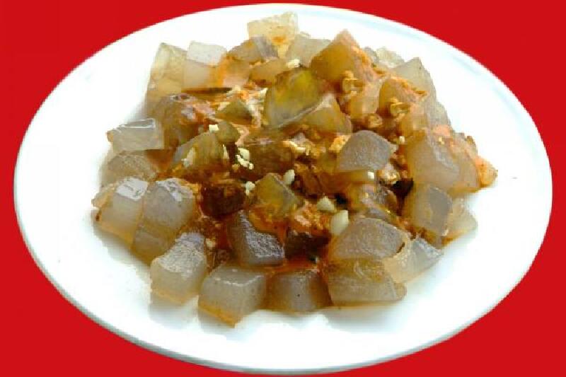 其知名代表首推烟台“焖子”。“焖子”的原料是用淀粉做成的凉粉,做法其实很简单:将凉粉切小块,用平底小锅细细煎炒,直至稍微有点焦,然后淋上虾油、酱油、醋、麻油、香油、芝麻酱等调料,撒上葱末、蒜末等,用细瓷小碟盛了,热腾腾地端上来,悠哉游哉 地用铁丝拧成的小叉,一块一块叉来,放入口中,又有筋道,又有味道。