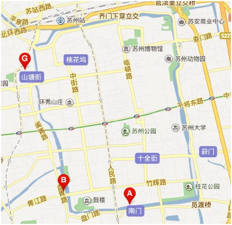 新市桥-盘门三景-新市桥(百花洲公园)-万年桥(古胥门)-干将桥-石路(万人码头)-阊门吊桥-平门(火车站、汽车北站)-齐门-娄门(东园)-相门(莫邪路)-葑门-觅渡桥(觅渡览月)-南园桥(古纤道)-人民桥(轮船码头)。