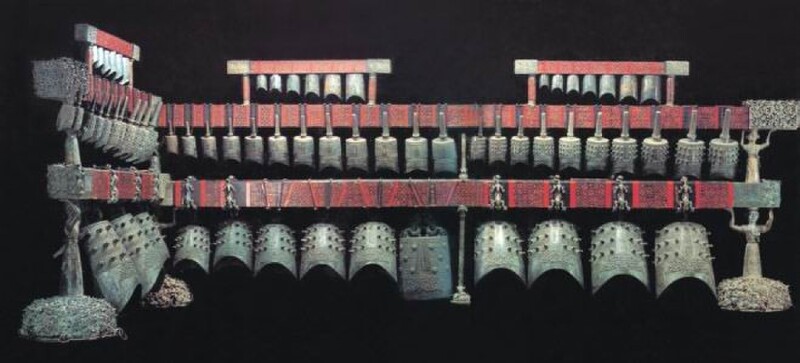 当时文物考古工作者们在湖北省随州市城西北约一公里名叫擂鼓墩的地方,发掘了一座战国早期大型木椁墓--曾侯乙墓,墓中出土了一万五千余件大量精美的青铜礼器、乐器、兵器、金器和玉器。其中规模巨大、保存最好的打击乐器——编钟,,皆为青铜铸造,共六十五件,重2500多公斤,今音乐性能良好,能演奏古今各种乐曲。这一巨大考古发现被誉为“世界奇观中独一无二的珍宝”,“古代世界的第八奇迹”,是“精神世界的圣山”。