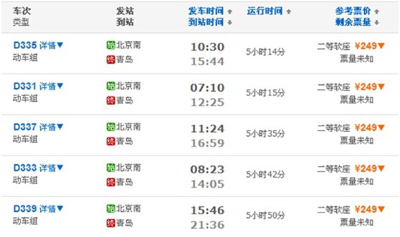 北京到青岛只有动车和高铁