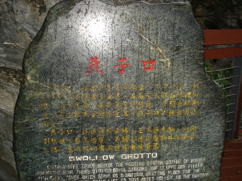 与溪畔隧道之间,是太鲁阁峡谷的一段峭壁。燕子口幽谷萦纡、山壁雄峻,是中横沿线的著名风景。从公路护栏边看,对岸山壁仿佛触手可及,真是近在咫尺。在公路右侧的岩壁上有着许多的小洞,由于受到溪流的日久侵蚀,比较松软的岩层滑落而慢慢形成了洞穴。在早期,这里常有雨燕、洋燕在空中成群飞舞,纷纷觅食,形成“百燕鸣谷”的壮观画面,因而获得了“燕子口”的美名。据传,这些洞穴式早年燕子筑巢而栖的地方。 现在的燕子口,因为中横开通后,游客不断,燕群已经被人声、车声竞走,只留下一个个空洞的岩穴。好些个洞穴现仍有水流喷出,所以又有人说这些洞穴的成因是因为其为地下水的出水口,亦有人人为洞穴式在流水喷出带动的砾石磨蚀下所出现的壶穴。燕子口是一个日照难以到达的地方,当有山风吹来,会夹着丝丝凉意,其阴森峻伟更让游人不敢逼近。燕子口有许多大理石,尤以燕子口、锥麓断崖、九曲洞一带的块状大理石岩最为壮观。这些大理石的原岩是石灰岩,受变质作用转变成了大理石。岩色呈白、灰或黑,形成了壮丽的山景。在其底下立雾溪峡谷深峻,滔滔流经,公路曲折回旋,气势万千。